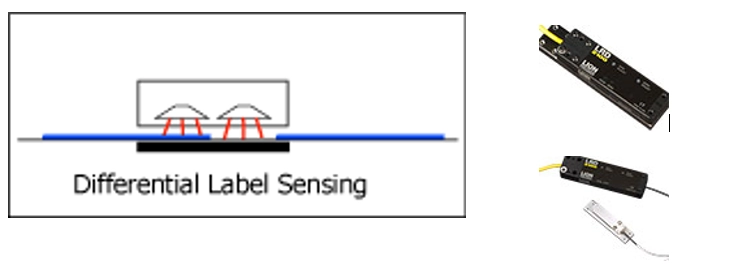La détection différentielle est obtenue en utilisant deux éléments de détection en haut du capteur, qui créent des champs électriques vers la plaque de base. Lorsqu'une étiquette se trouve dans le capteur, les deux champs électriques se comportent de la même manière. Lorsqu'un espace entre dans le capteur, le champ électrique au-dessus de l'espace change, mais pas l'autre. L'électronique du capteur détecte cette différence et signale la présence d'une étiquette au contrôleur d'impression. Ce type de capteur ne voit que des changements d'épaisseur. Pour cette raison, le capteur a rarement besoin d'être réglé parce qu'il ne se soucie pas de savoir si l'étiquette est épaisse ou mince – il ne voit que les changements.