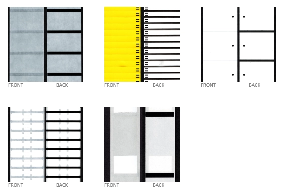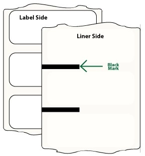 Certaines imprimantes d'étiquettes peuvent également être équipées d'un capteur « réfléchissant » qui repose sur des lignes de repérage ou des marques noires imprimées au verso du support de l'étiquette. La largeur de la marque noire est synchronisée avec la taille de l'étiquette pour indiquer à l'imprimante quand imprimer d'une étiquette à l'autre. Les marques noires sont particulièrement utiles lorsque les étiquettes sont « bout à bout », séparées uniquement par une perforation ou une découpe de la face avant. Comme nous devrons imprimer les marques noires pour vous, cette méthode de détection augmente le coût de la fourniture.