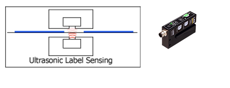 La détection par ultrasons fonctionne un peu comme la détection capacitive unique, sauf qu'au lieu d'un champ électrique, elle utilise de l'énergie sonore à haute fréquence. Un transducteur de transmission (« haut-parleur ») situé à la base du capteur transmet le son à un transducteur de réception (« microphone ») situé en haut du capteur. La bande d'étiquettes réduit la quantité de son qui atteint le récepteur. Plus la bande est épaisse, moins il y a de son au niveau du récepteur. L'électronique du capteur mesure la pression acoustique au niveau du récepteur et déclenche la commande lorsqu'un bord d'étiquette est détecté. Cette technologie n'est pas sensible aux matériaux métalliques.
