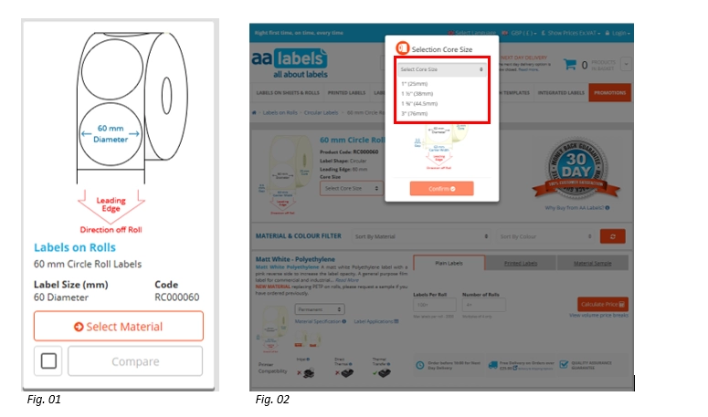 Lorsque vous commandez vos étiquettes en rouleaux via notre site Web, après avoir sélectionné la forme et la taille de vos étiquettes, vous devez sélectionner le matériau d'étiquette que vous souhaitez (Fig. 01) et à ce stade, on vous demandera de sélectionner une « taille de support » avant de continuer (Fig. 02).