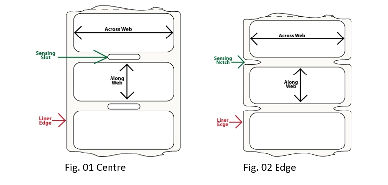 Les encoches de détection sont découpées sur le bord du support comme montré sur la Fig. 02 ci-dessus et n'ont pas besoin d'un espace plus grand. Les encoches sont utilisées non seulement avec des étiquettes sur des supports brunes ou très opaques, mais aussi avec des matériaux d'étiquetage qui n'ont pas de support ou d'espace entre les étiquettes. Ceci explique pourquoi vous voyez souvent des étiquettes volantes avec des perforations entre chaque étiquette et quatre coins arrondis qui forment ces encoches.