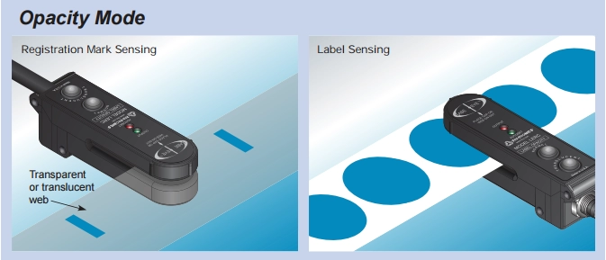 Un avantage significatif de la détection du mode d'opacité par les capteurs d'espace est que l'utilisateur n'a pas à se préoccuper du flottement de la bande ou de la lumière ambiante, y compris les flashs stroboscopiques. En fonction de ce que vous essayez de détecter, les capteurs de mode d'opacité peuvent vous fournir le signal de sortie souhaité pour exécuter les fonctions de la machine. Les applications typiques comprennent la détection d'étiquettes sur un rouleau, la détection de marques de repérage sur un matériau d'emballage imprimé et la détection de jointures sur des bandes continues de matériau.