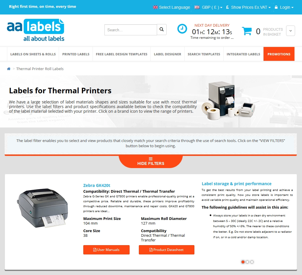 Vous pouvez ensuite utiliser le filtre d'étiquettes montré plus haut pour choisir la forme et la taille de l'étiquette et procéder comme décrit précédemment pour sélectionner le matériau, la quantité d'étiquettes et le nombre de rouleaux.